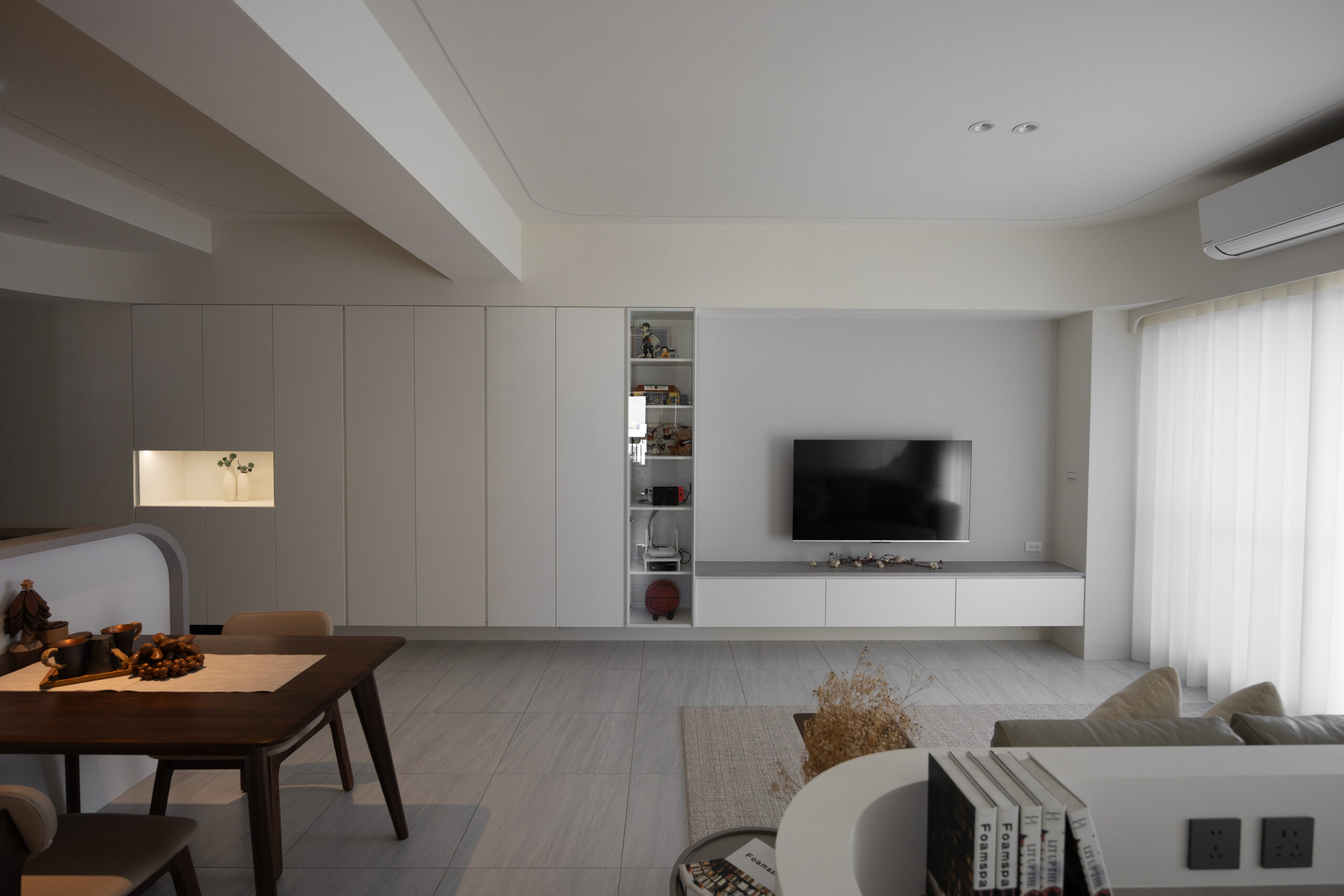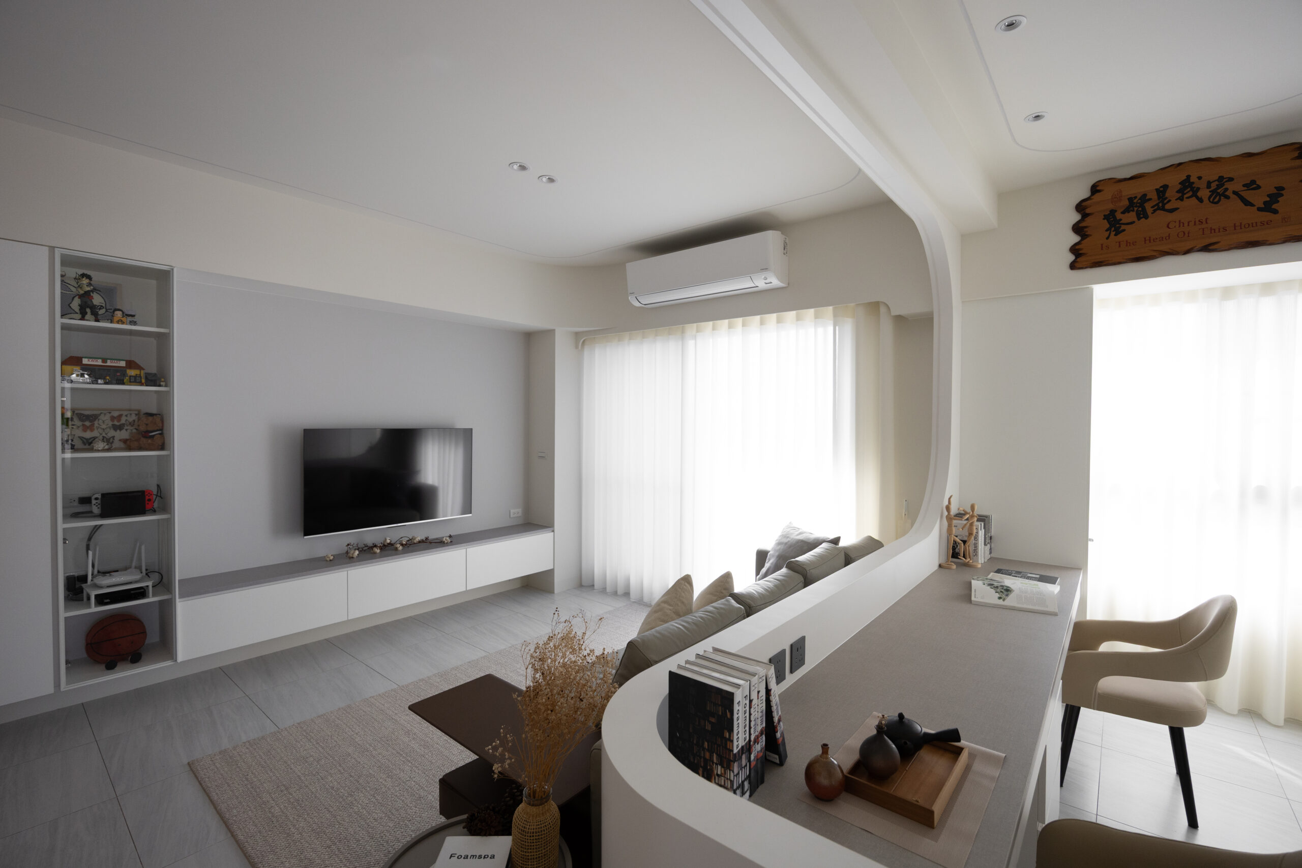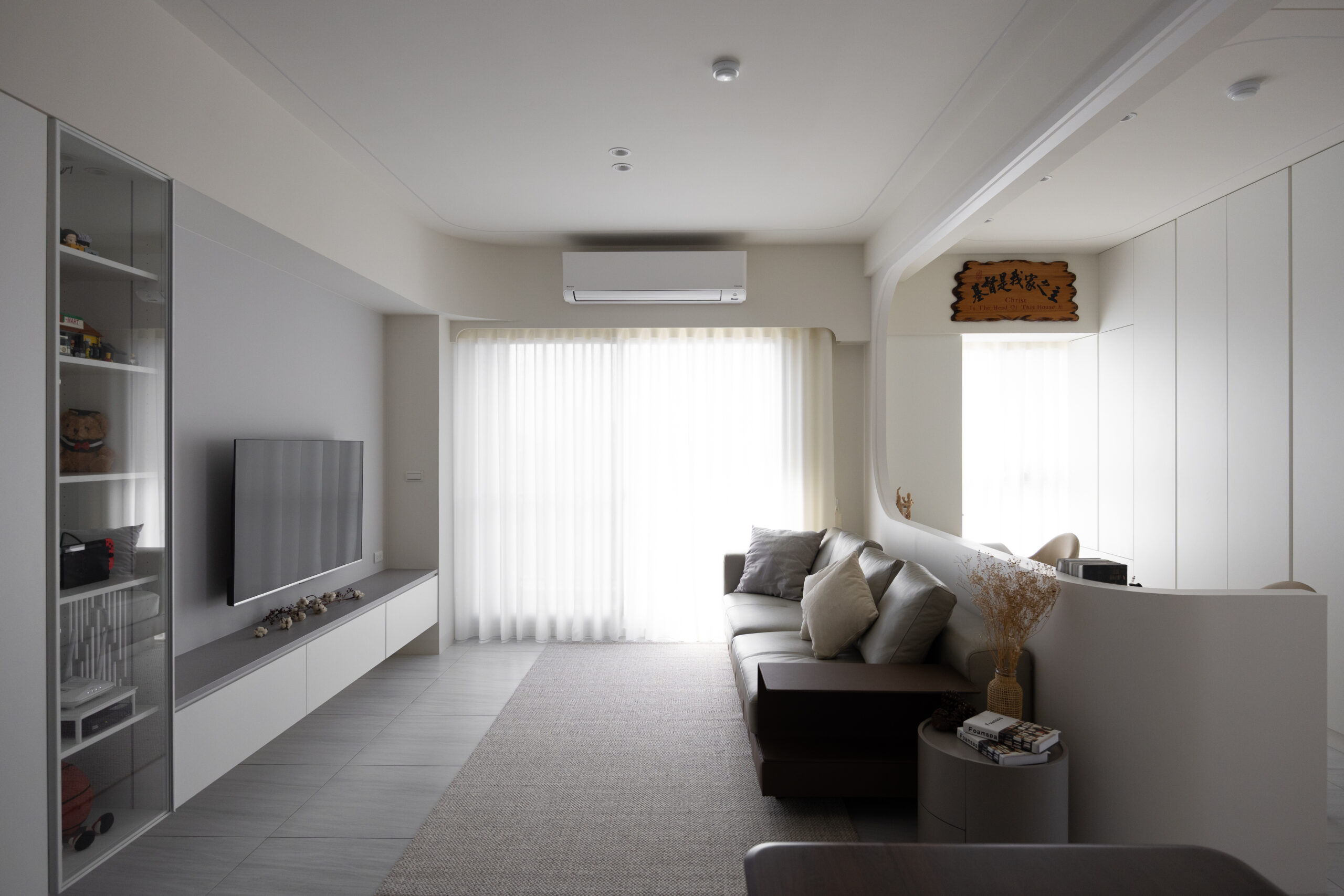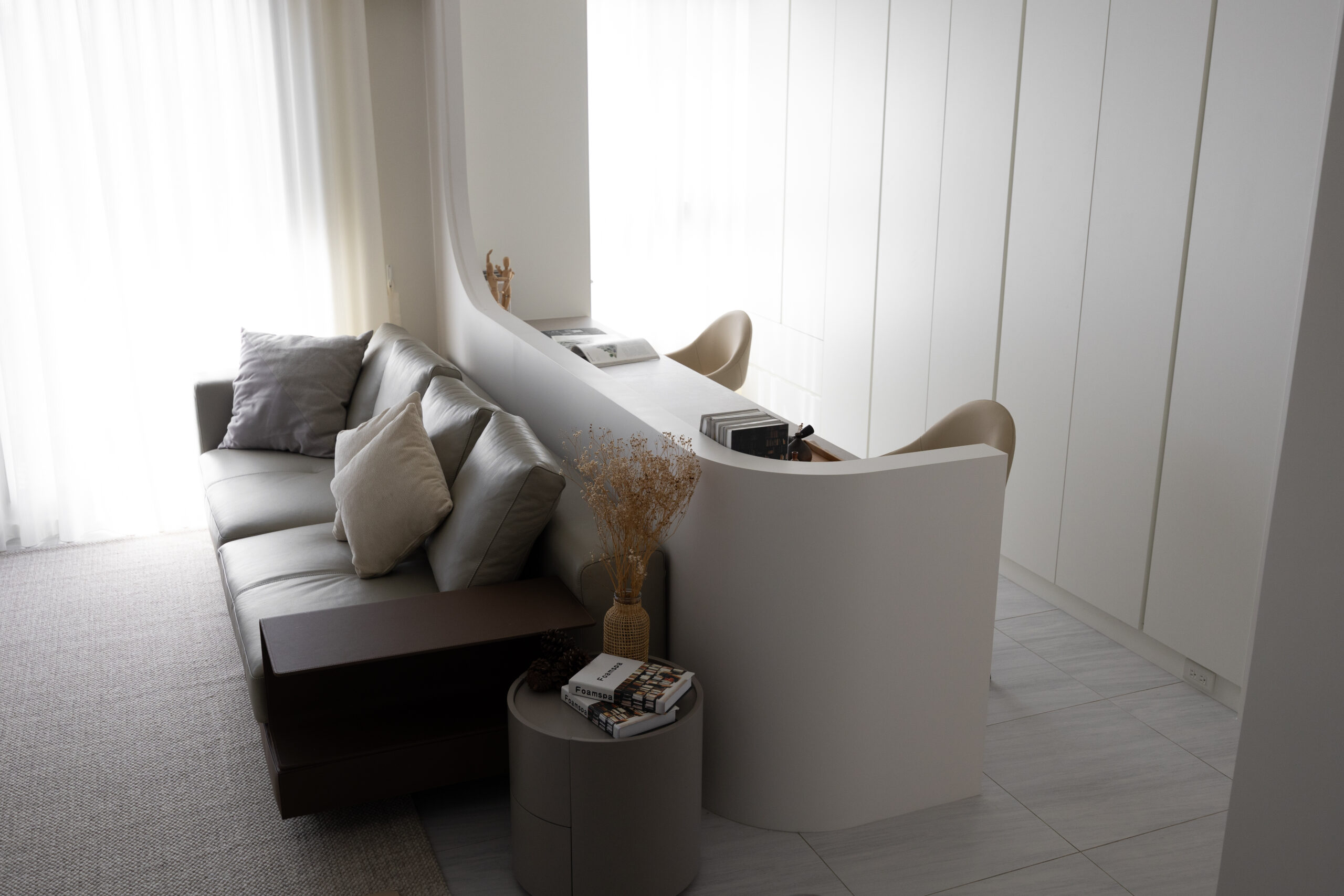 本案以純白與暖灰為基調,透過磁磚的低斂質感,營造出明亮且寬闊的視覺公領域。我們打破了傳統格局的束縛,大膽運用流線型木作設計,讓硬裝線條化作溫柔的動線指引,賦予家更多層次的律動美感。