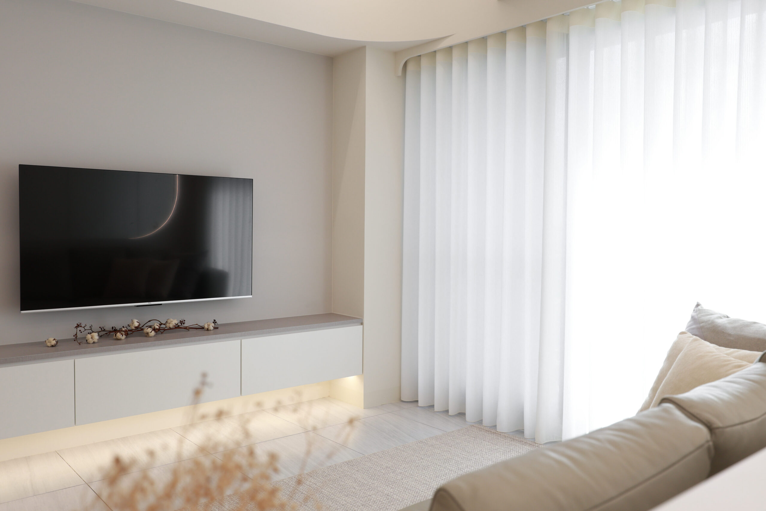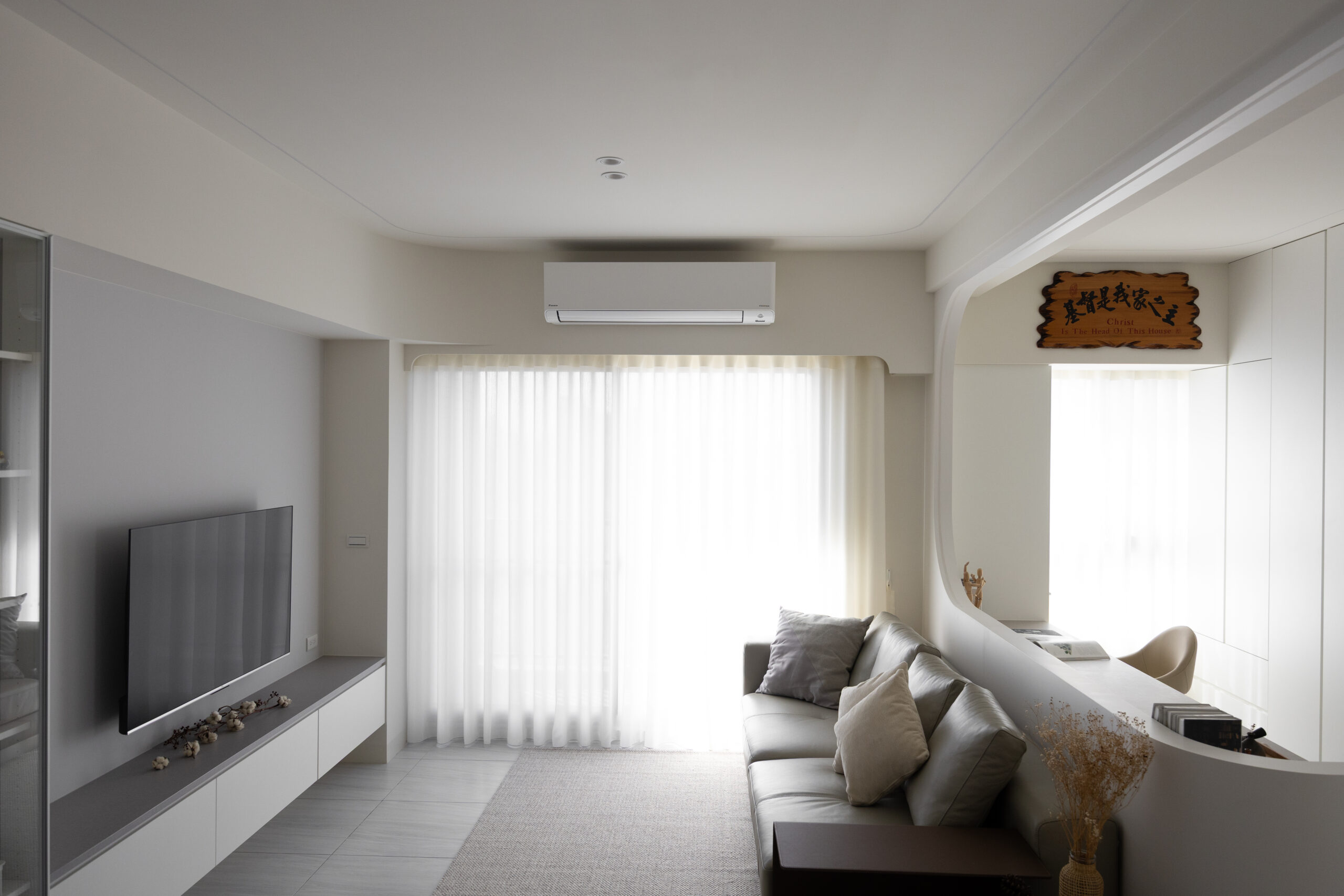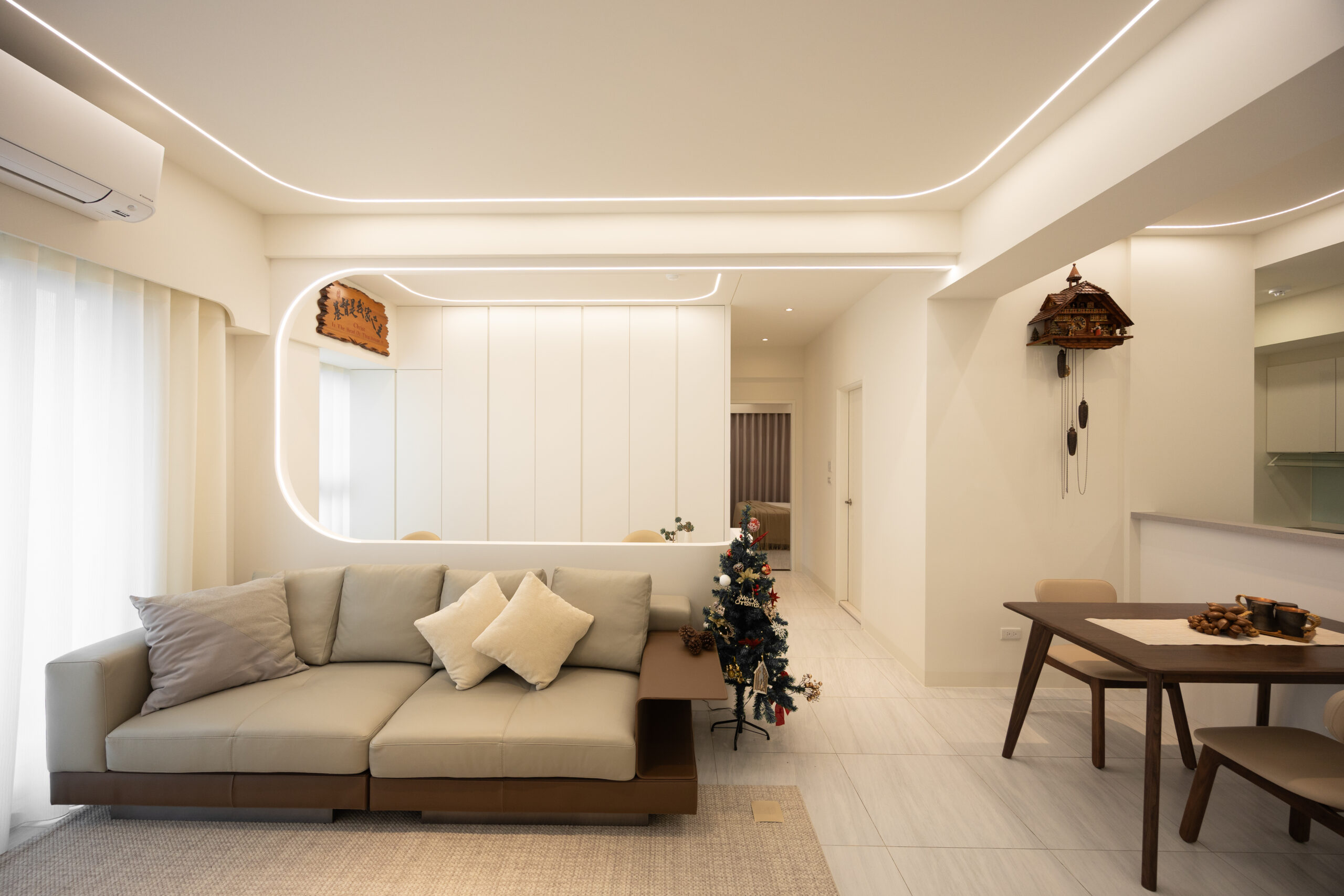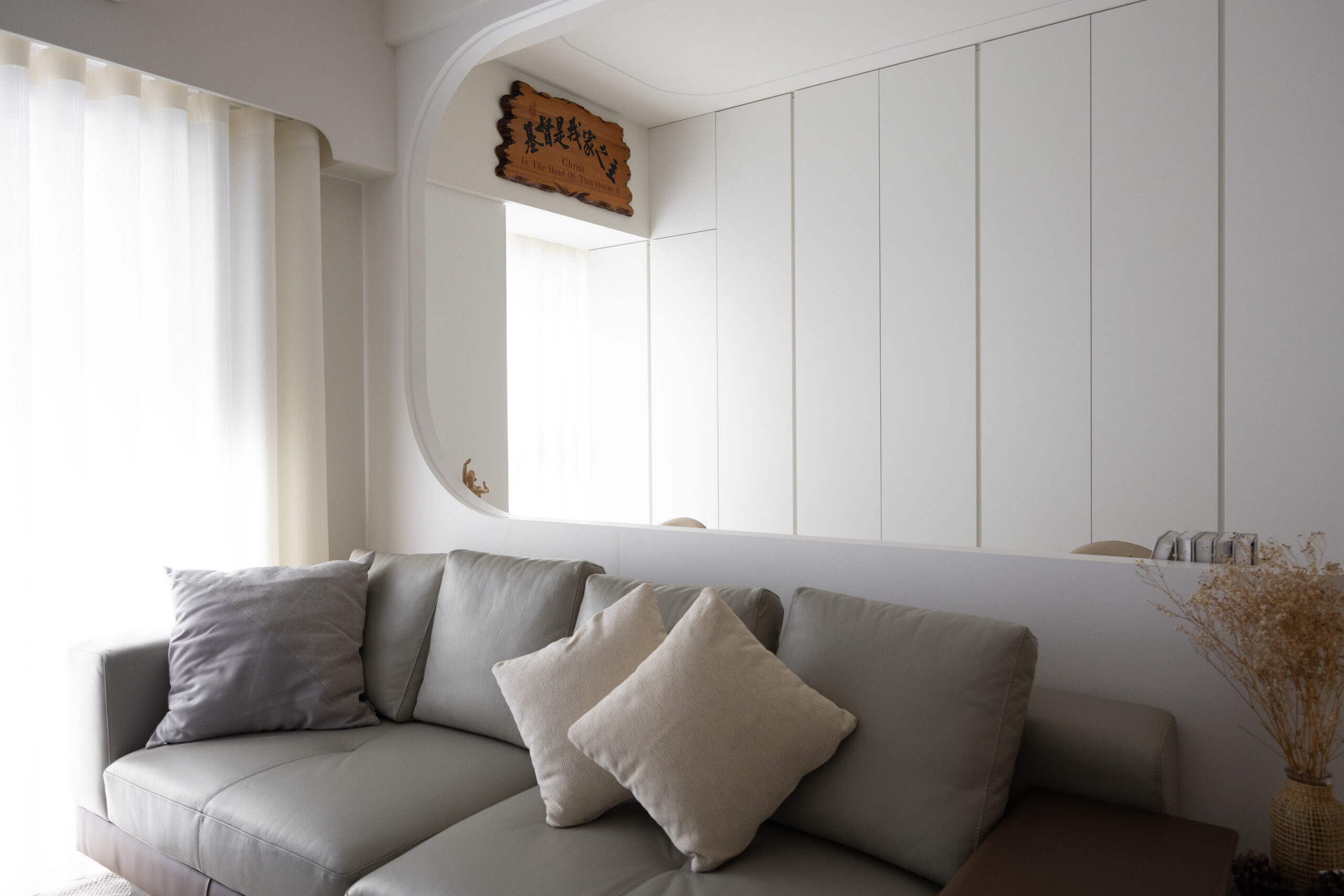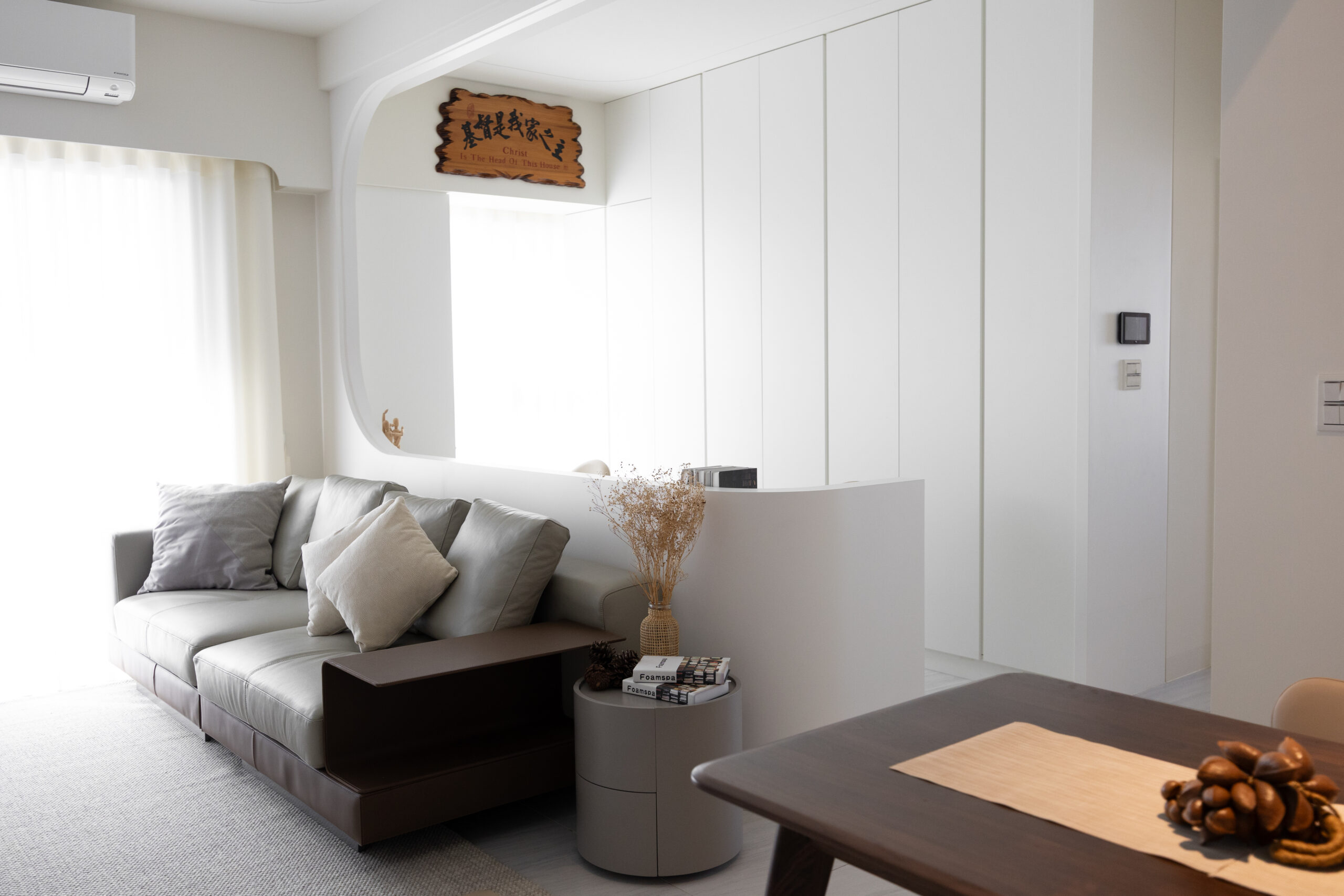 本案以純白與暖灰為基調,透過磁磚的低斂質感,營造出明亮且寬闊的視覺公領域。我們打破了傳統格局的束縛,大膽運用流線型木作設計,讓硬裝線條化作溫柔的動線指引,賦予家更多層次的律動美感。