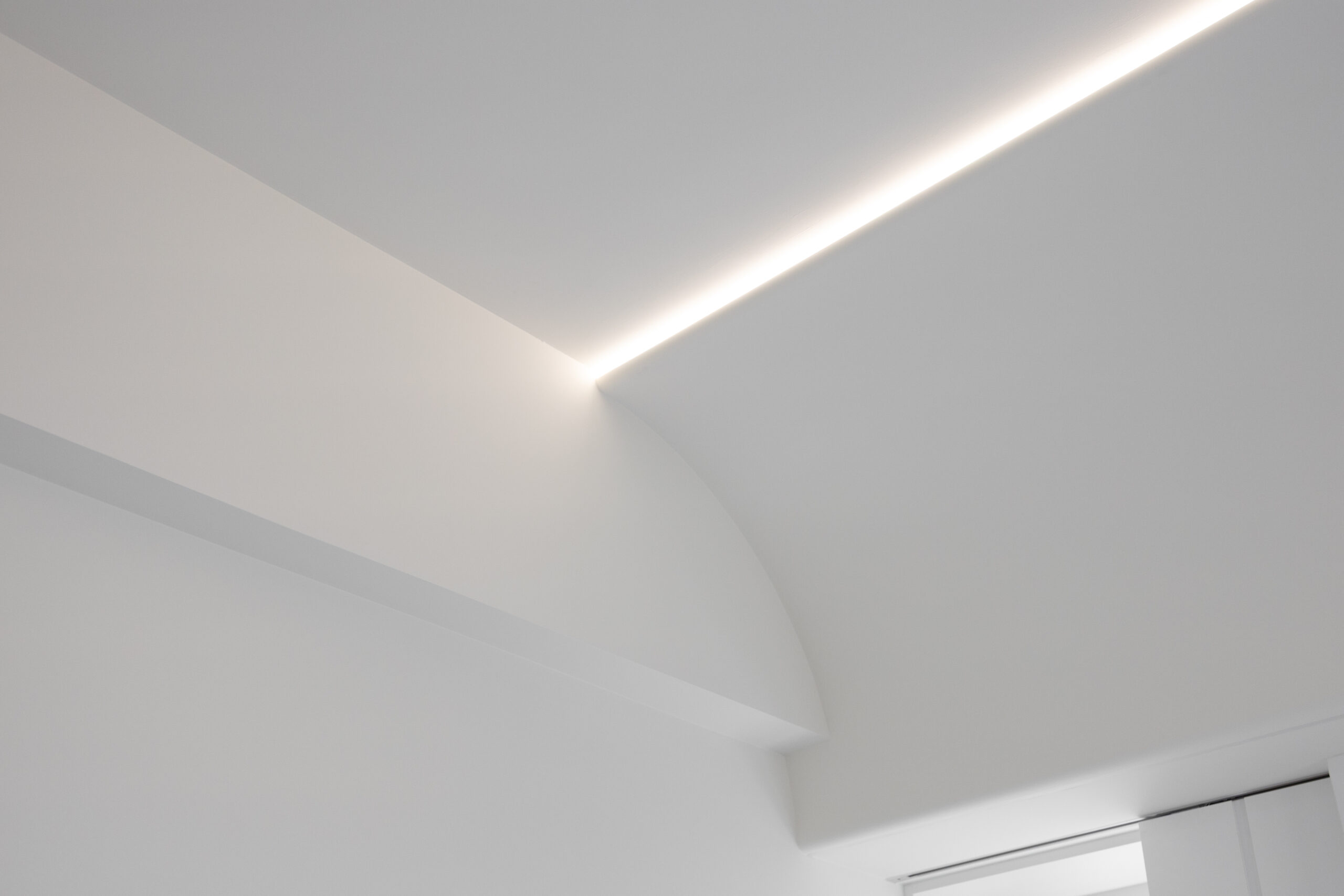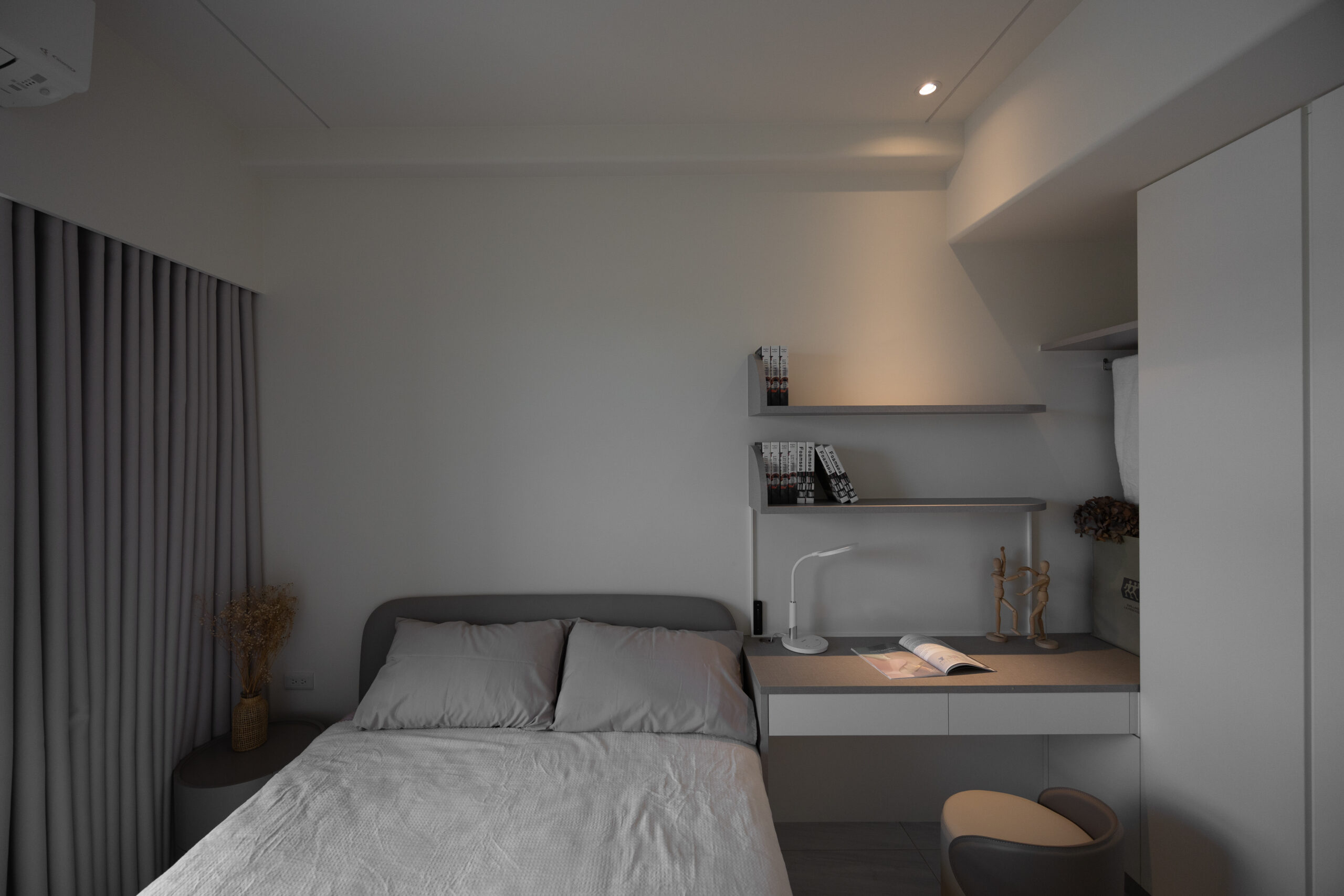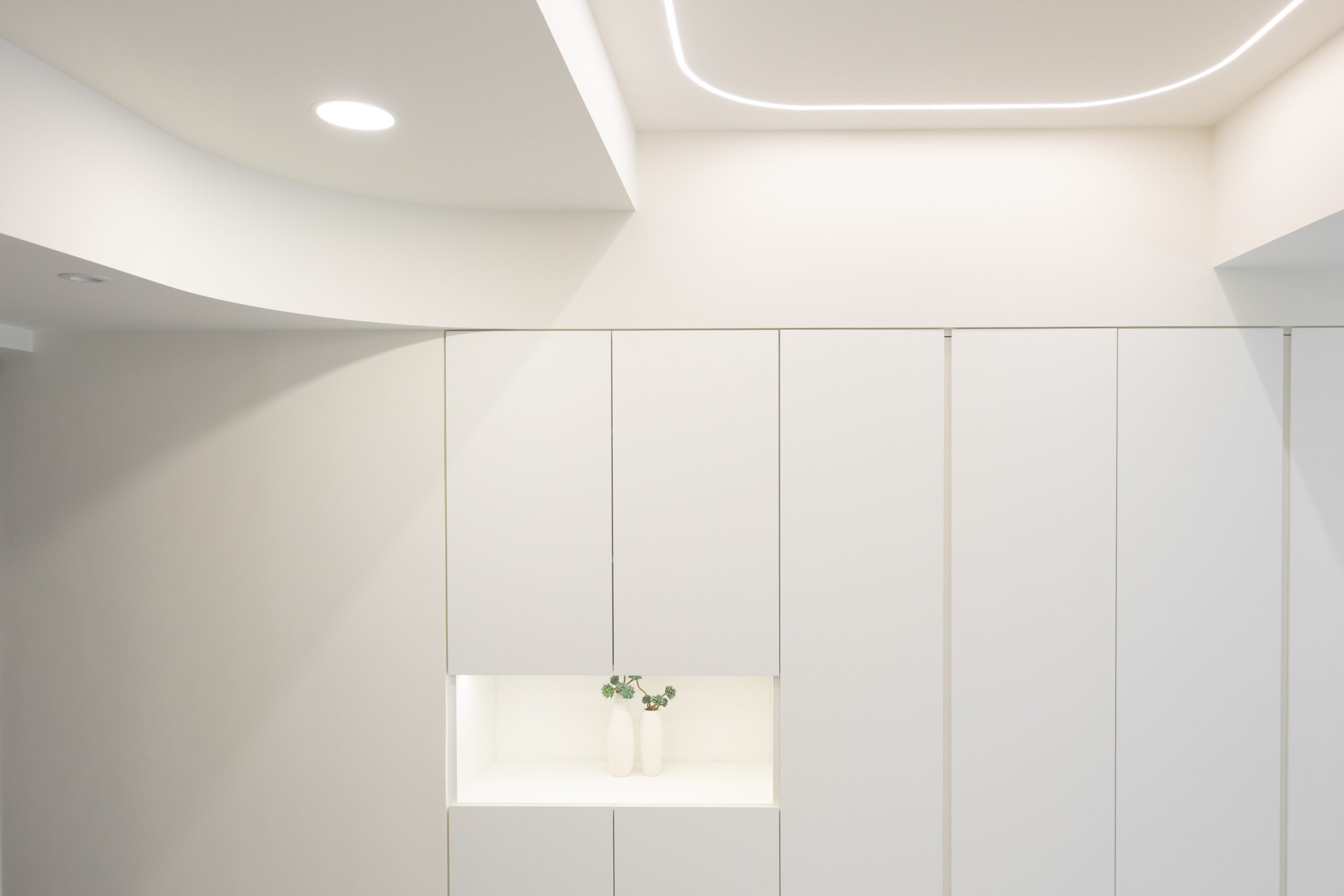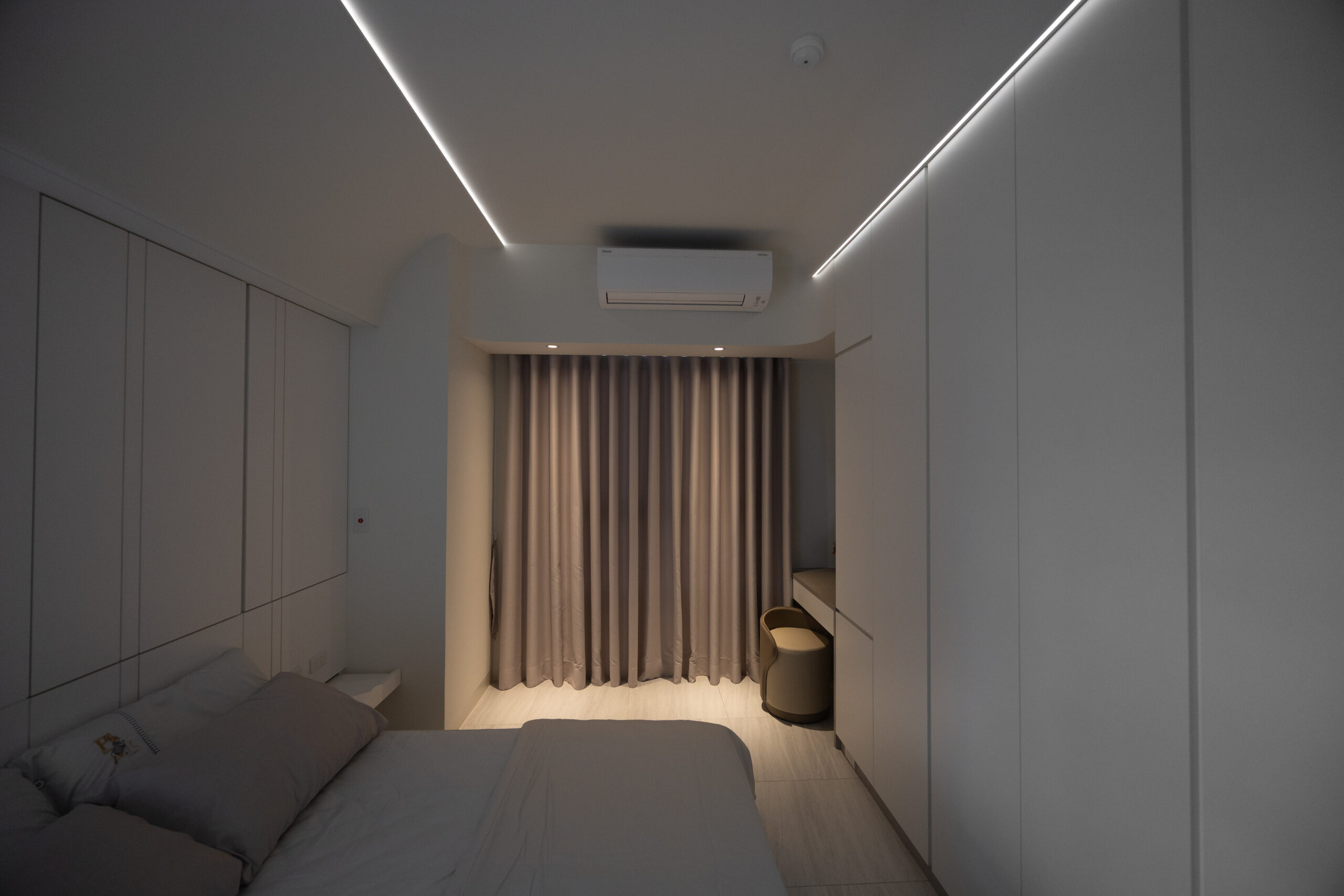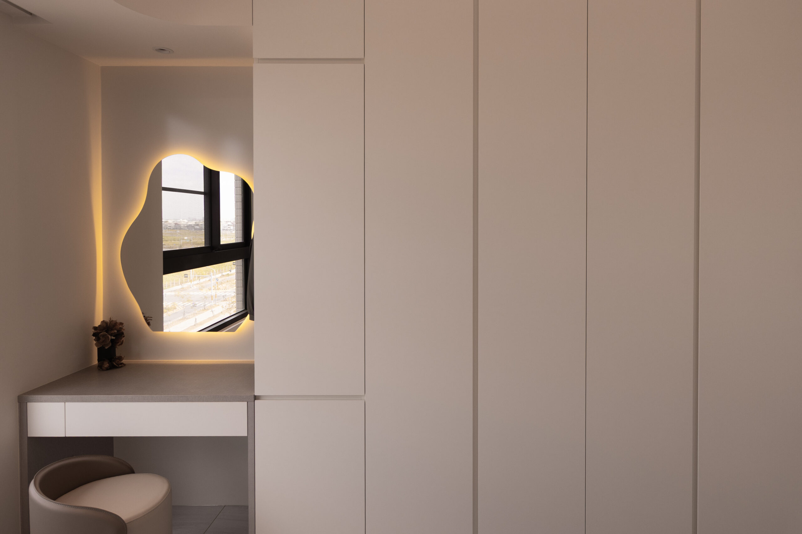 臥室延續了公領域的弧線元素,化妝鏡與收納櫃體皆以圓潤收邊,搭配線性光帶的引導,讓休息空間在極簡中仍保有一份包裹式的安全感。